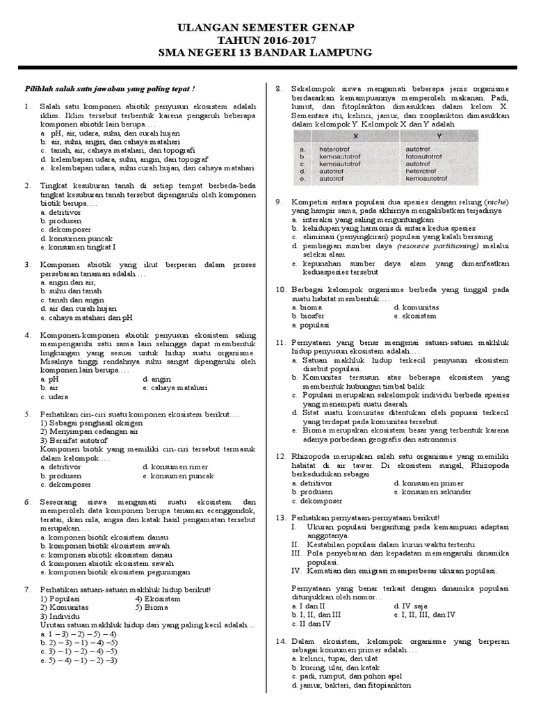 Soal ekologi kelas 12. Mulai belajar lagi yuk tentang Biologi Kelas 12 SMA. Berikut ini adalah rincian Soal UAS Biologi Kelas 12 SMAMA Semester 1. Artikel ini memberikan kompilasi soal-soal untuk memantapkan persiapan UASPAS semester Genap kelas 12 untuk kurikulum KTSP K13 dan K13 Revisi.